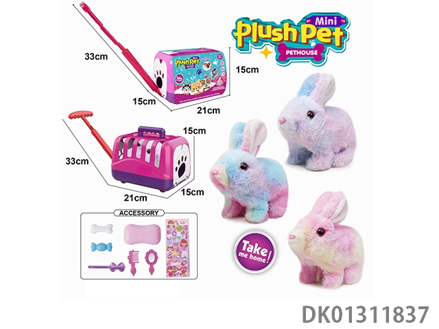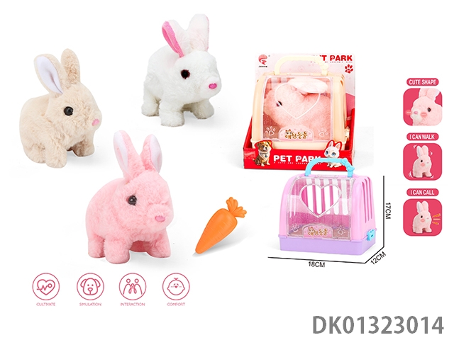 Electric plush colored walking rabbit and hand pulled animal cage and accessory set