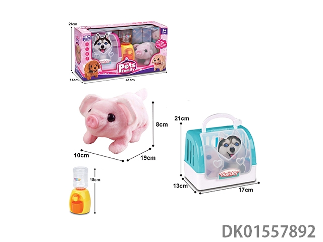 Electric plush pink pig and 2-color portable cage and water dispenser