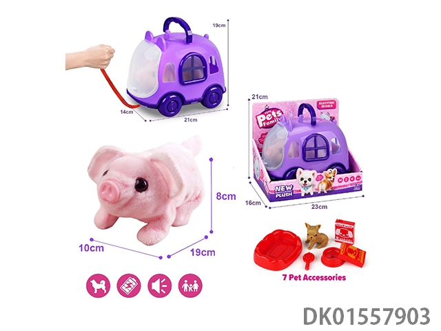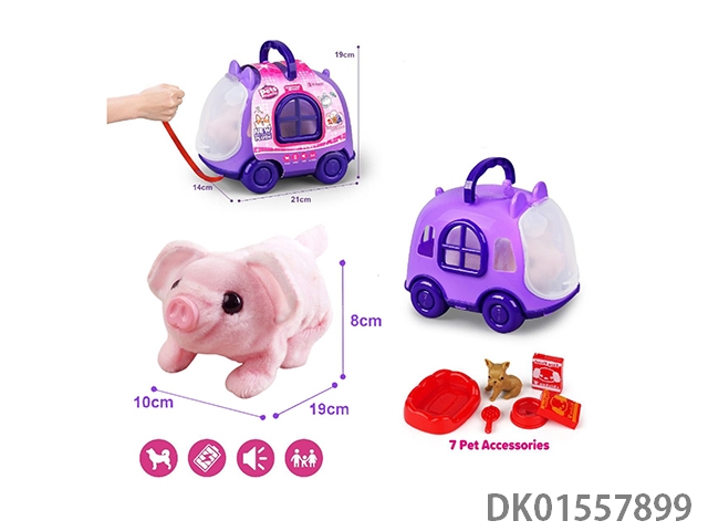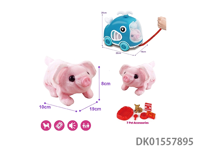 Purple rope pulling cart and electric plush pink pig and accessories