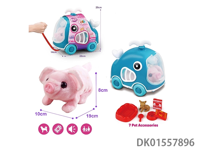 Whale rope pulling cart and electric plush pink pig and accessories