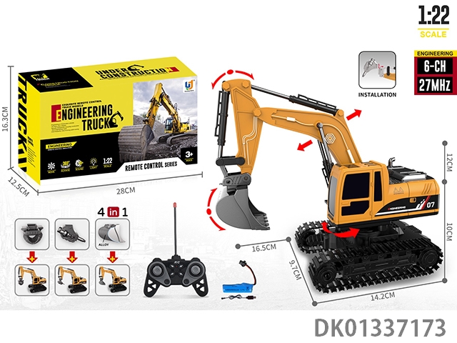 27Mhz 6-way 1:22 action sound effect digging bucket, gripper, drilling, alloy head digging bucket (4-in-1) remote control engineering vehicle (excluding electricity)