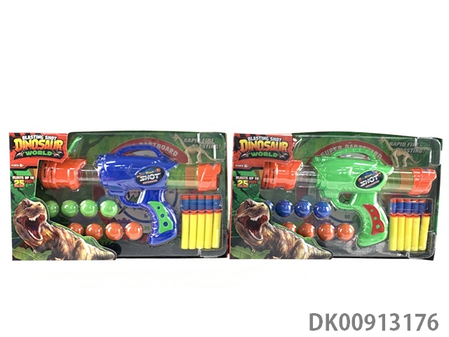 Routine of dinosaur version: aerodynamic gun, soft bullet gun, 2 small dinosaur bones and multi choice configuration eva ball shell and suction cup soft bullet 2 in 1 function\