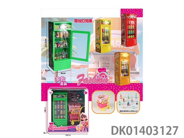 Play house toy lighting beverage cabinet with solid transparent beverage and shopping cart