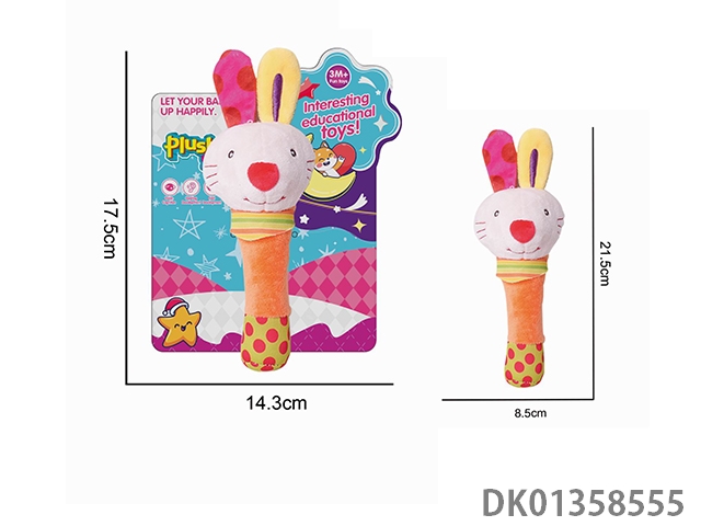 Plush little rabbit holding a baby pacifier toy with a ringling bb stick