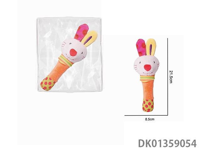Plush little rabbit holding a baby pacifier toy with a ringling bb stick