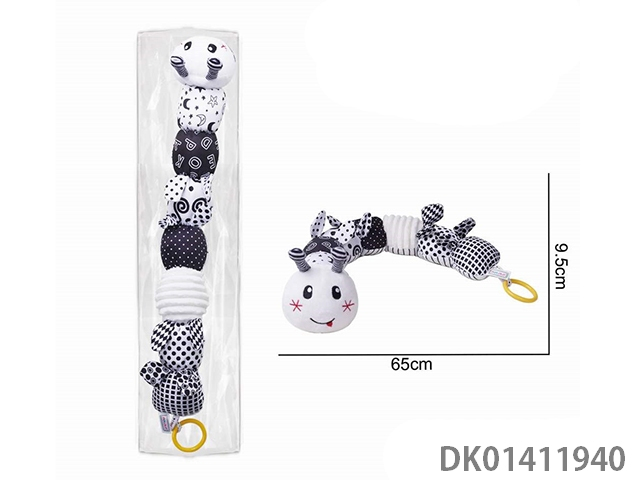 Plush black and white caterpillar, paper ringing bell, teething gum, soothing toy