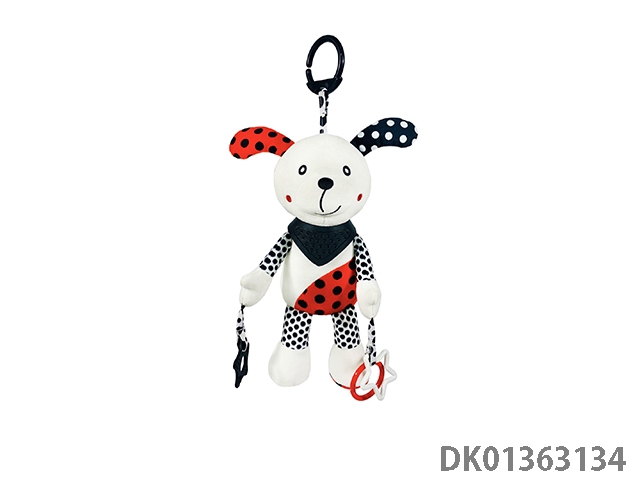 White puppy baby soothing bell with teething ring and plush pendant