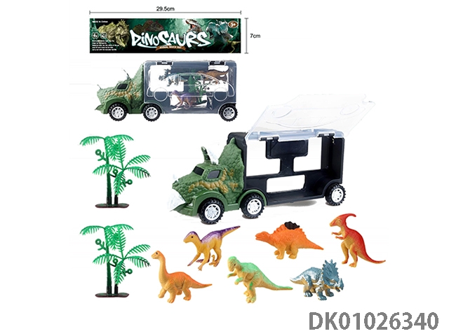 Dinosaur storage car and 3 dinosaur children and 1 tree