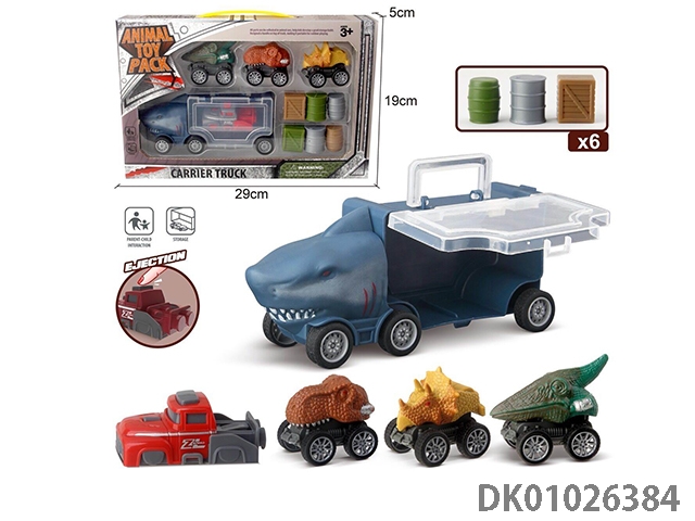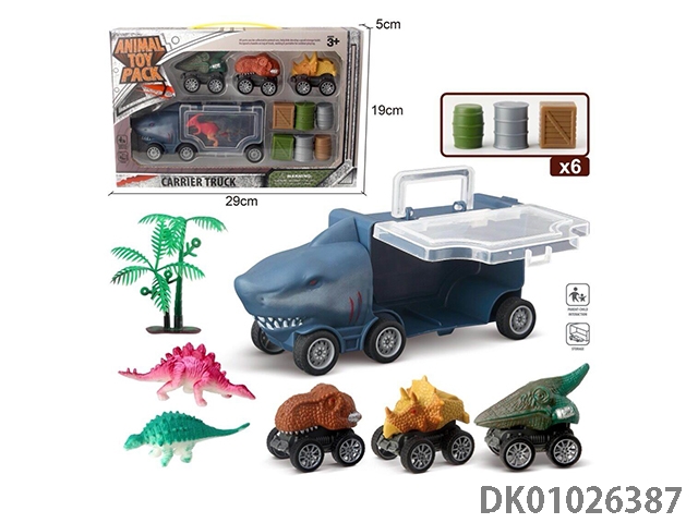 Shark storage car and 3 dinosaur cars and 1 ejection and 6 accessories