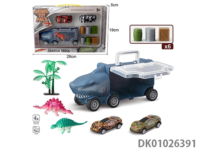 Small shark storage car and 2 iron sheets, 2 dinosaurs, 1 tree and 6 pieces