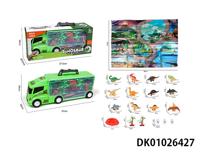Portable gift box container taxi tractor with 6 dinosaurs and 3 eggs and 1 coconut tree and 1 beach motorcycle and 1 airplane and 4 fences and 1 map and 1 volcano and 1 stone
