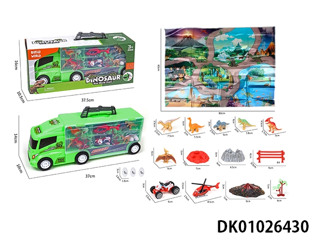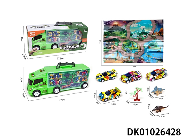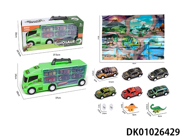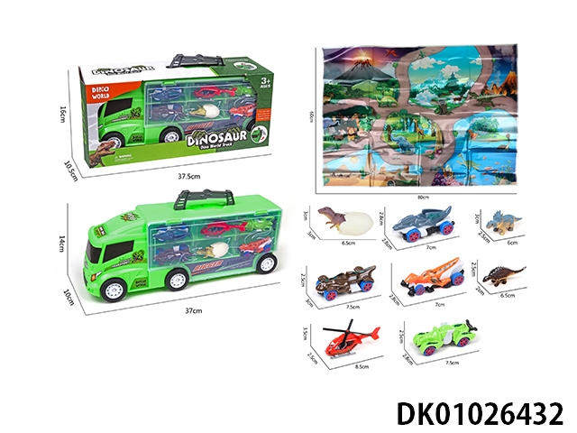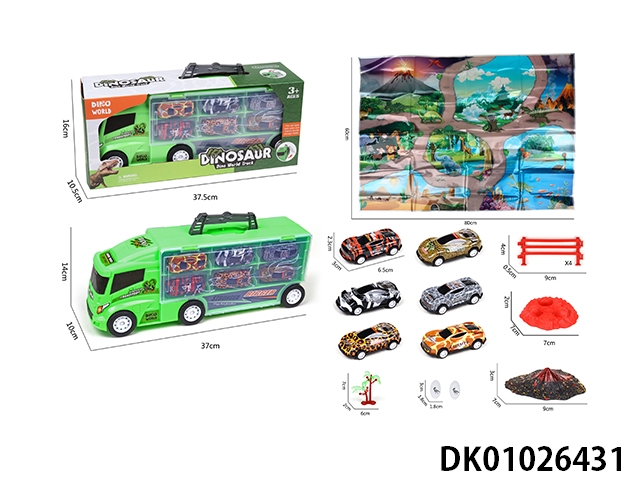 Portable gift box container sliding tractor with 6 huili dinosaur iron cars, 2 dinosaurs, 2 eggs and 1 map