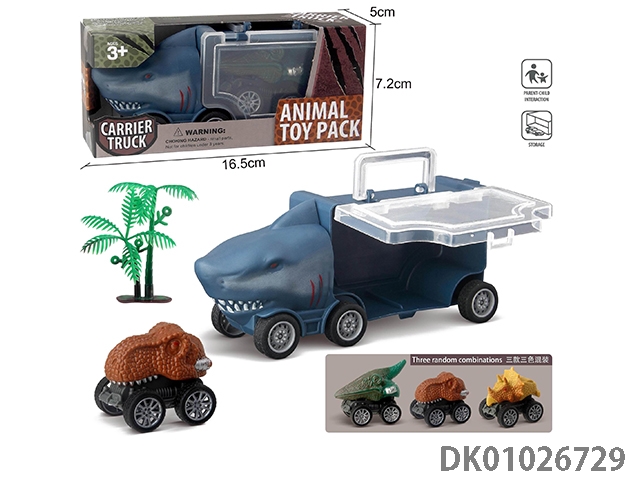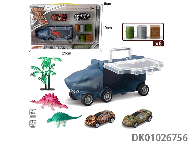 Small shark storage car and 2 iron sheets, 2 dinosaurs, 1 tree and 6 pieces