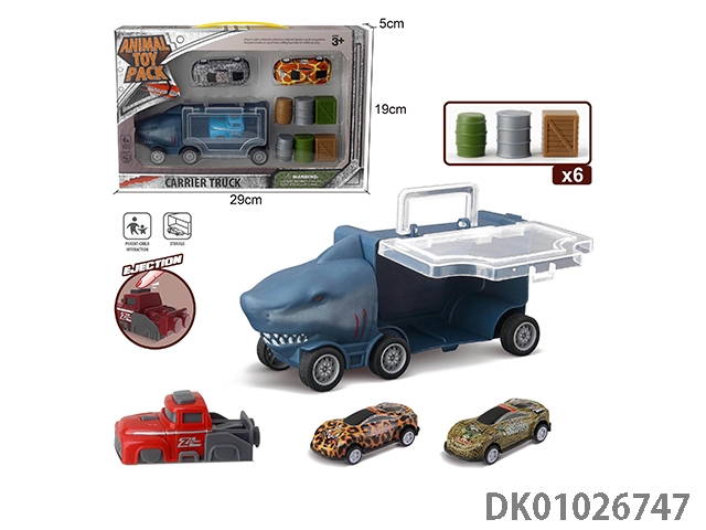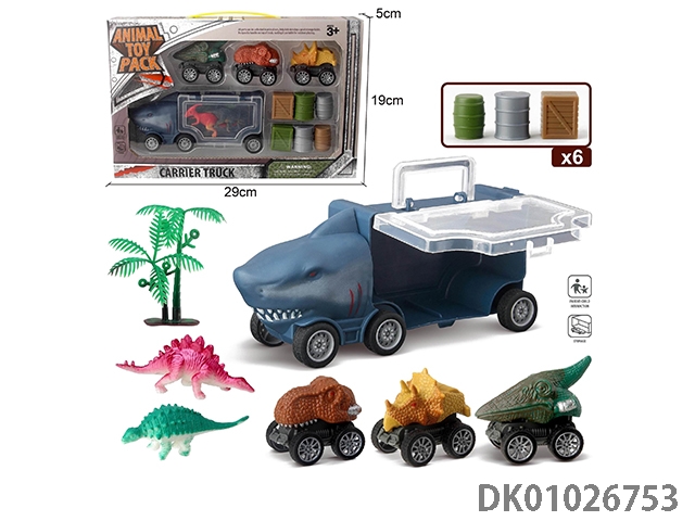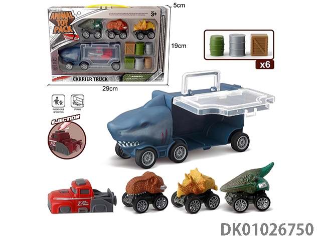 Shark storage car and 3 dinosaur cars and 1 ejection and 6 accessories