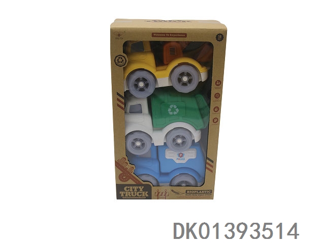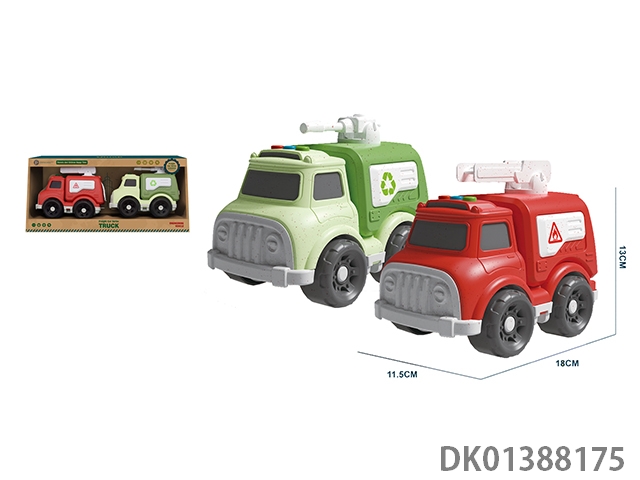 Two sets of sliding sanitation vehicles/fire trucks (made of wheat straw)
