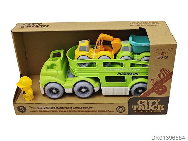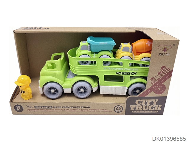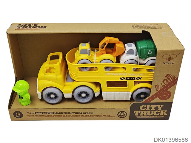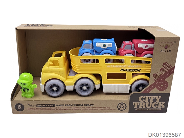 Straw material sliding cartoon trailer transport vehicle (with 1 cartoon character and 2 sliding cars)