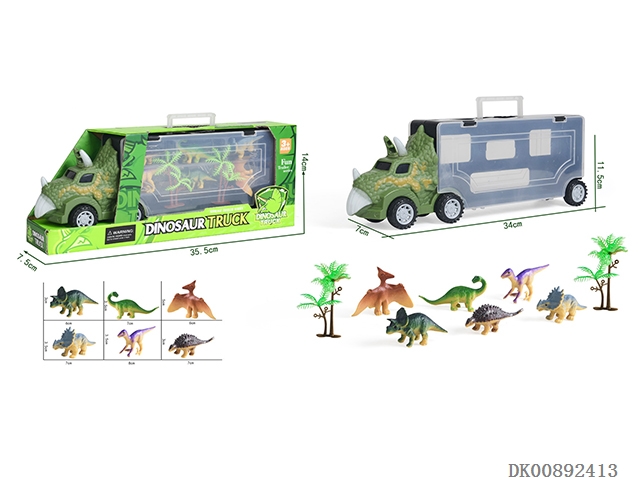 Triceratops container taxi tractor carries 6 small dinosaurs and 2 trees