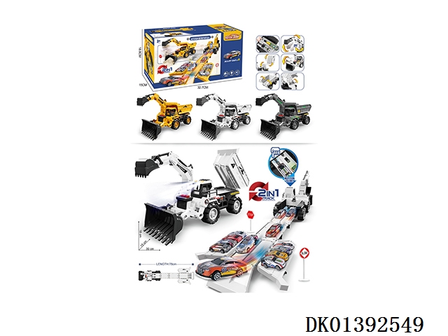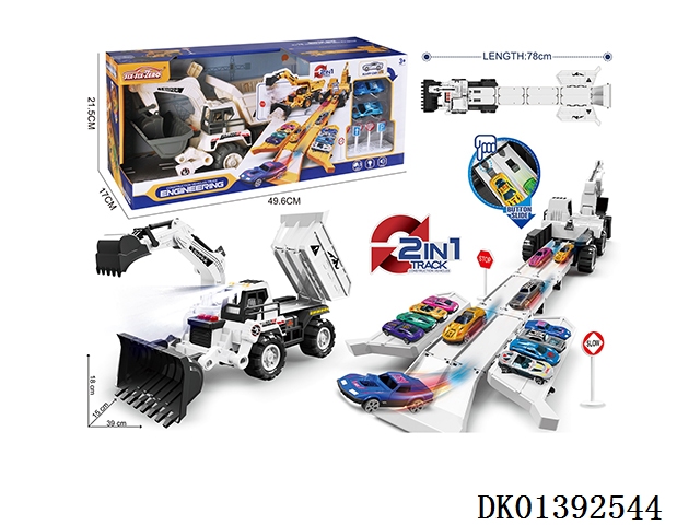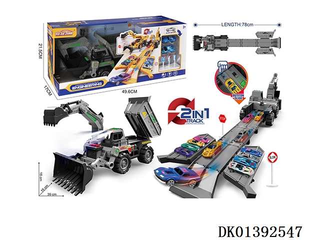 Light and music alloy deformation storage catapult engineering vehicle (equipped with 2 alloy vehicles and 7 road signs) (3 ag13 button batteries - included)