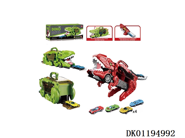 New portable and deformable swallowing alloy car dinosaur track storage car (equipped with 4 sliding alloy cars) green/red 2-color mixed