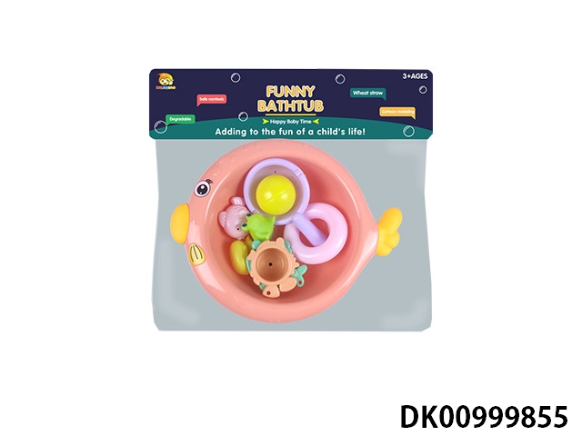 Round fish basin with bath accessories and plastic lined animals