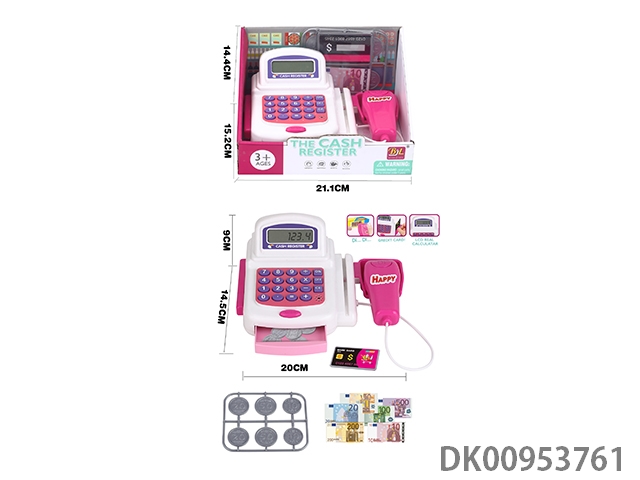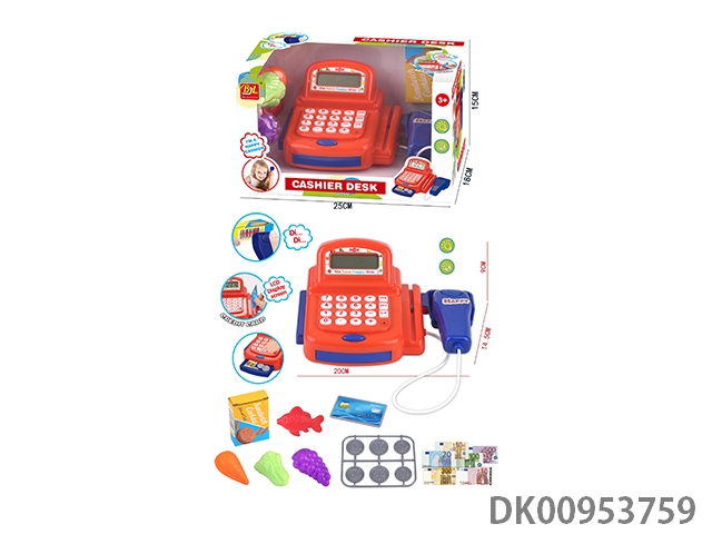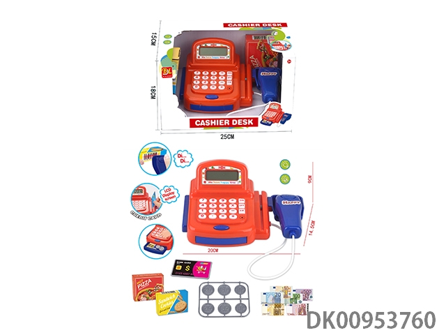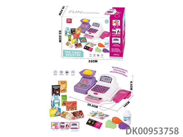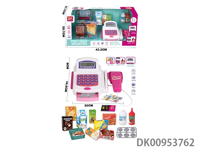 Key count cash register with chocolate and noodles and milk and orange juice and black tea and biscuits and pizza and coins