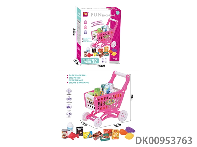Shopping cart with chili sauce and milk and chocolate and biscuits and noodles and biscuits and radishes and grapes and lemons and fish and coins