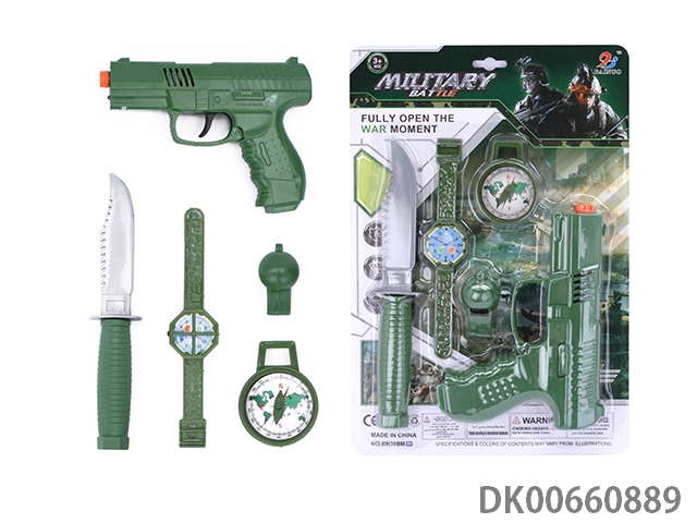 Military kit (handcuffs and badge, parking sign and grenade * 2, walkie talkie and telescope, camera and whistle with keyring and revolver soft bullet gun and bullets * 10)