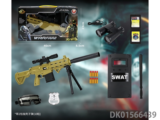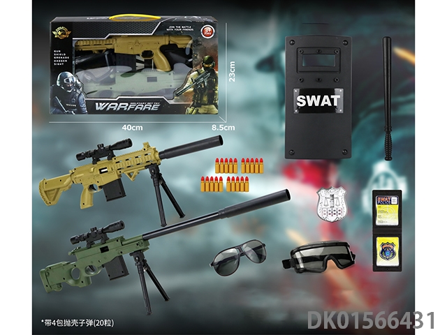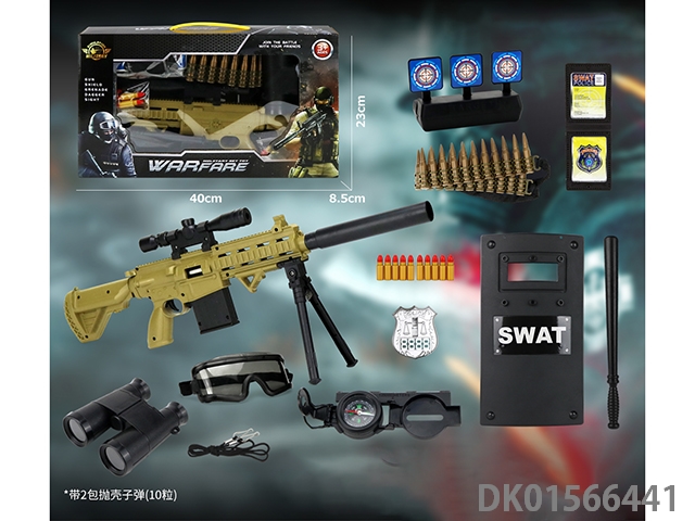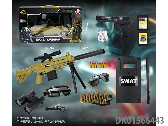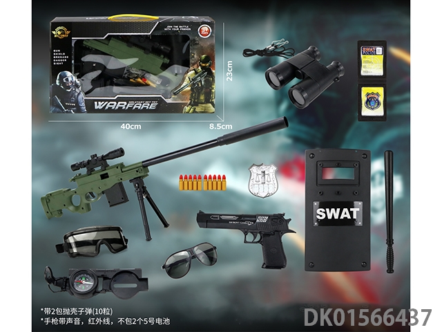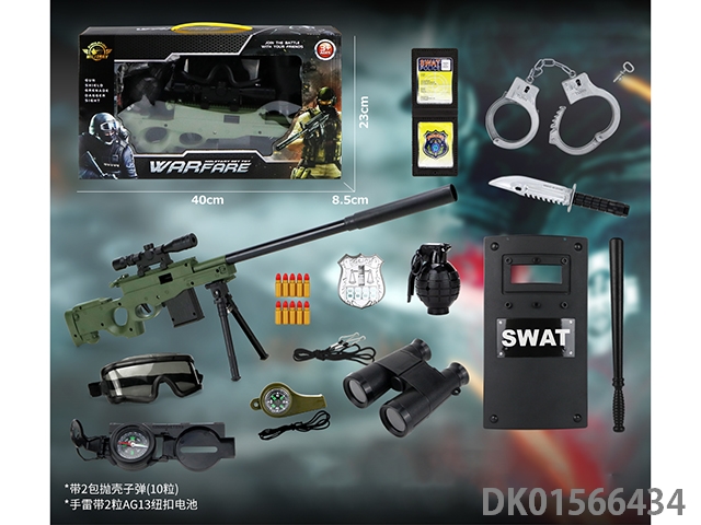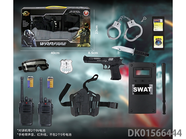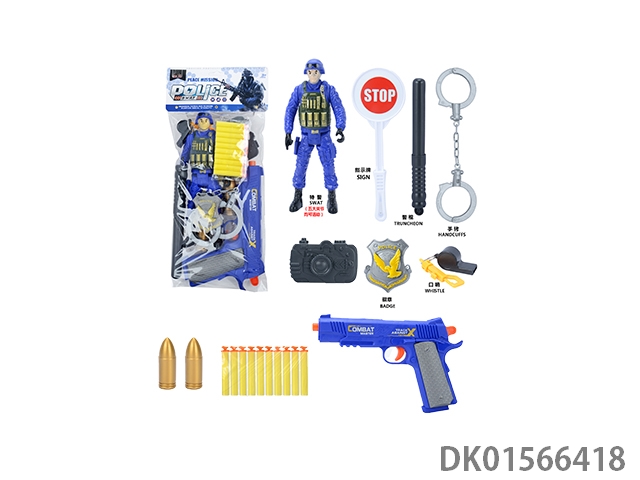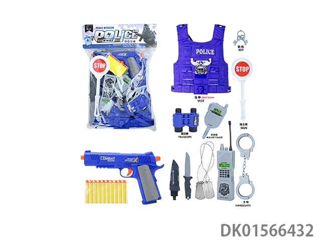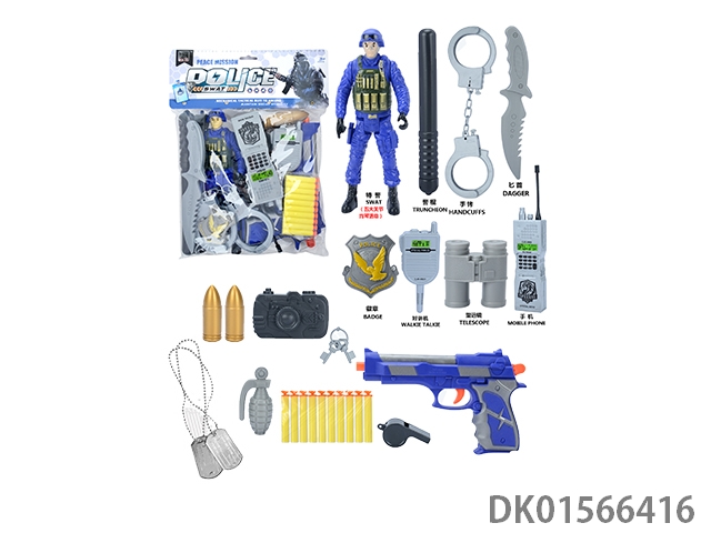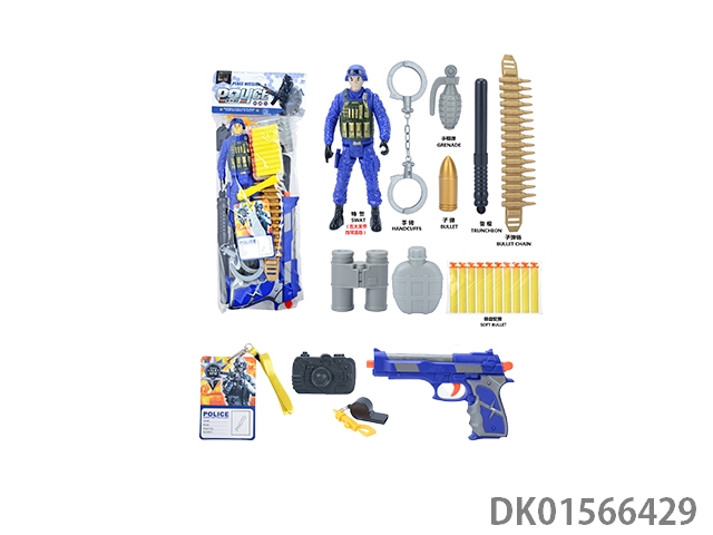 Police kit (military personnel, batons, handcuffs, walkie talkies, badges, binoculars, whistles, gold bullets * 2, hang tags, grenades, and may fourth soft shell guns)