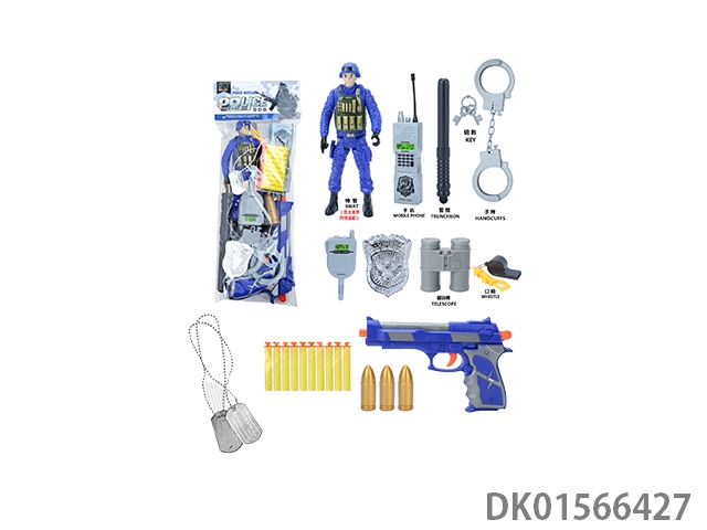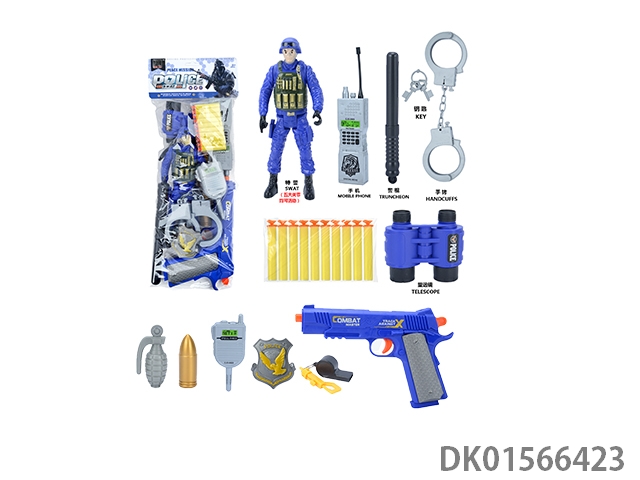 Police kit (military personnel, walkie talkies, batons, handcuffs, badges, binoculars, whistles, hang tags, and gold bullets * 3 and may fourth soft bullet guns)