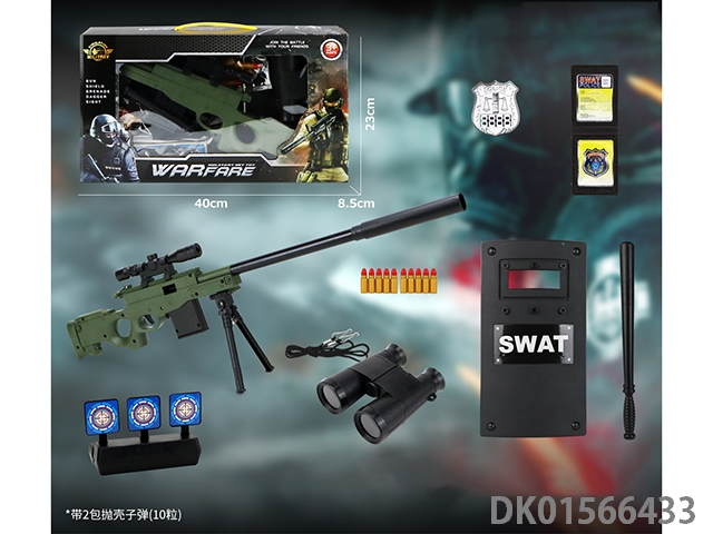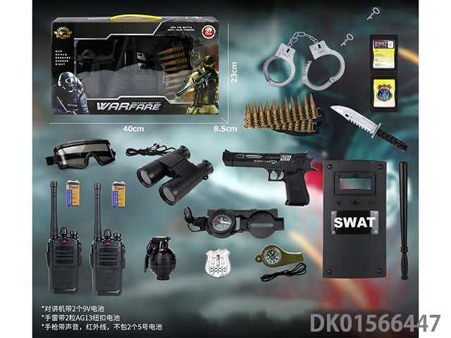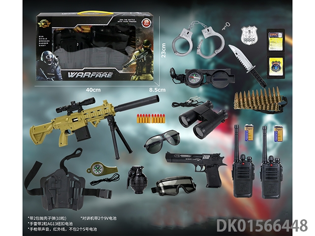 Police kit (military personnel, batons, handcuffs, knives, badges, walkie talkies, binoculars, gold bullets * 2, cameras, hang tags, grenades, whistles, and may fourth soft shell guns)
