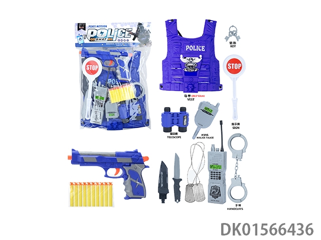 Police kit (bullet clip and police wearing chest armor, may fourth soft bullet gun and binoculars, knife and hang tag, walkie talkie and handcuffs)