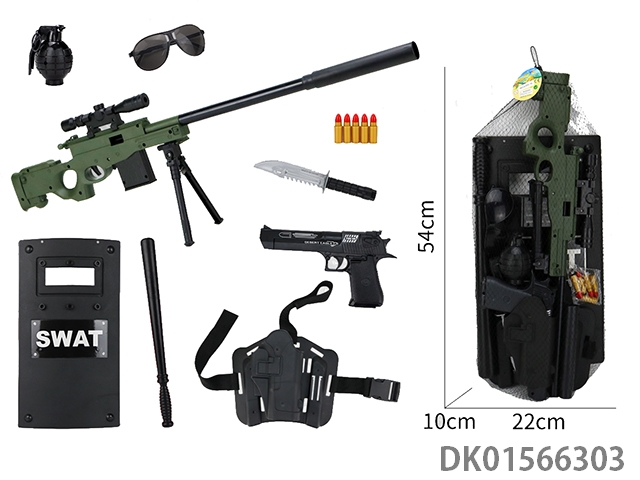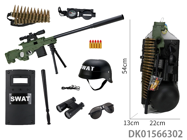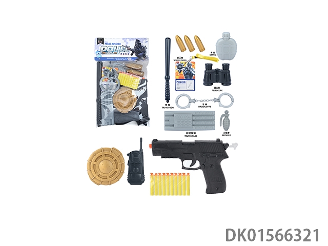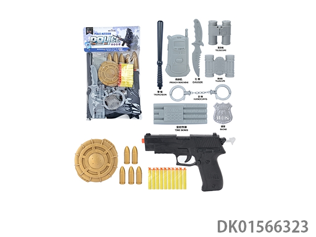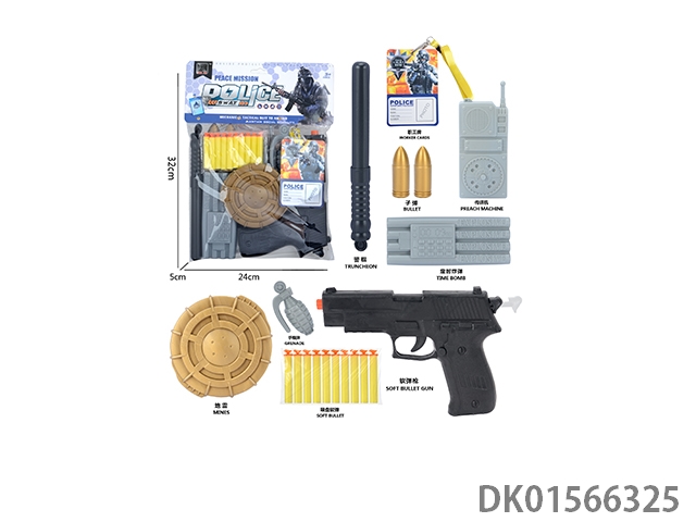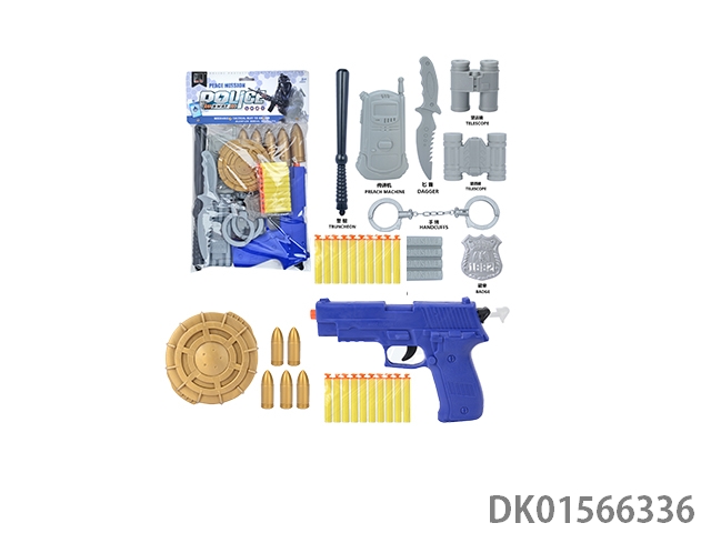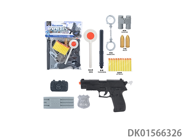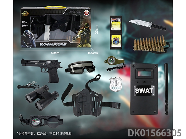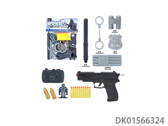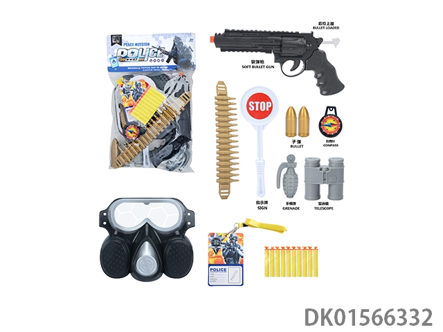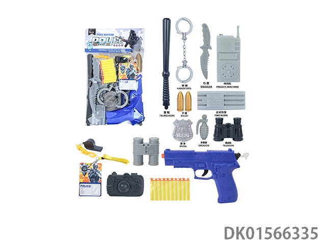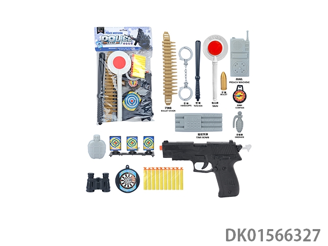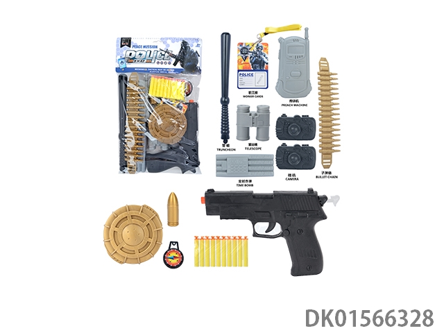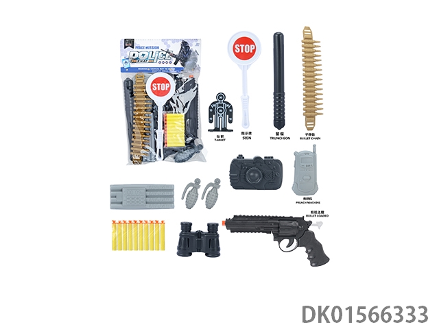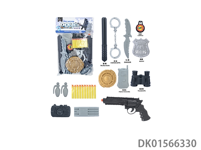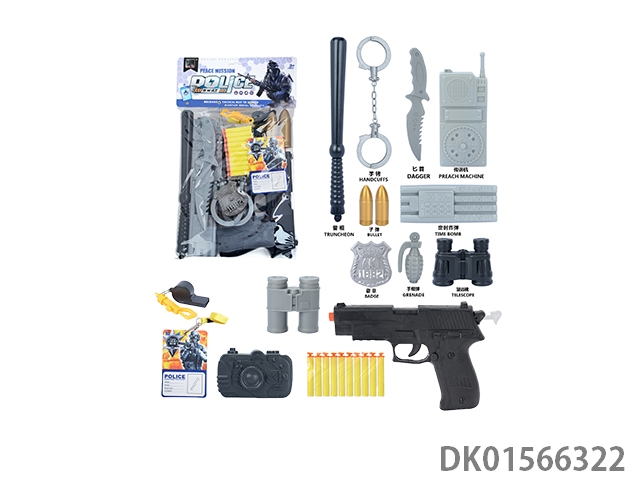 Police kit (baton and hang tag, binoculars and walkie talkie, camera * 2, timed bomb and bullet chain, landmines and gold bullets, compass and bullet clip, and may fourth soft bullet gun)