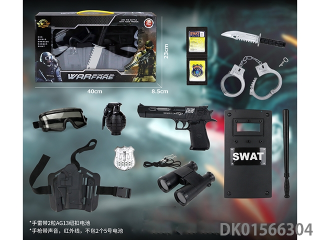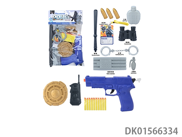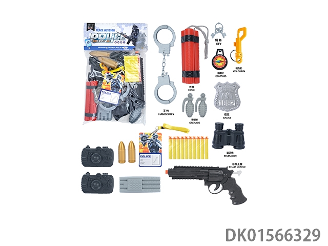 Police kit (baton, handcuffs, knife, walkie talkie, gold bullet * 2, timed bomb, badge, grenade, telescope * 2, hang tag, camera, whistle, and may fourth soft bullet gun)