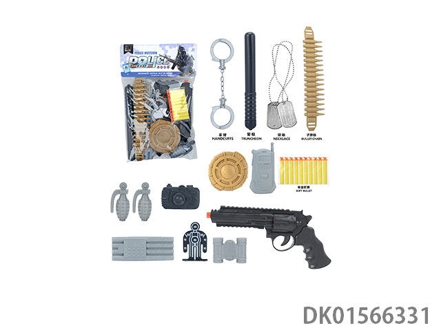 Police kit (baton, handcuffs, knife, walkie talkie, gold bullets * 2, time bomb, badge, grenade, telescope * 2, whistle, hang tag, camera, and may fourth soft bullet gun)