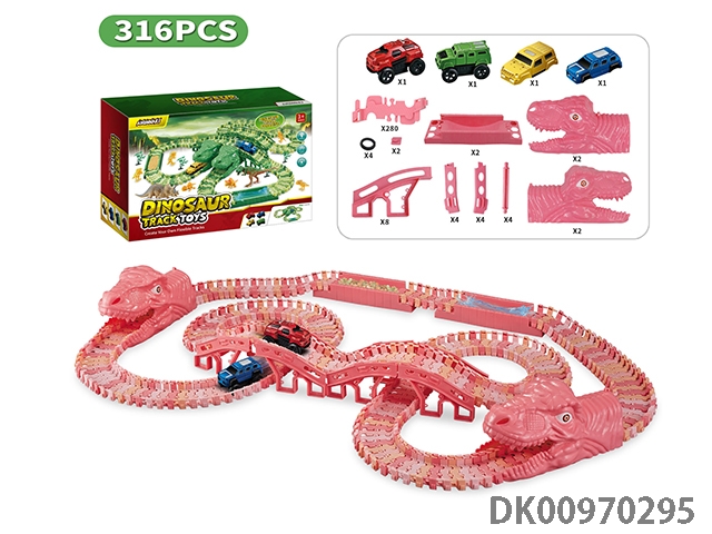 Jurassic world 3: rule - pink dinosaur assembled track electric vehicle (equipped with 2 electric vehicles, replaceable car shell, 280 track pieces) the electric vehicle needs 1 aaa battery, and does not pack electricity