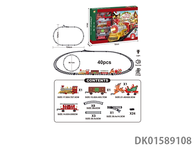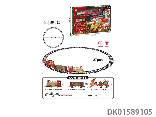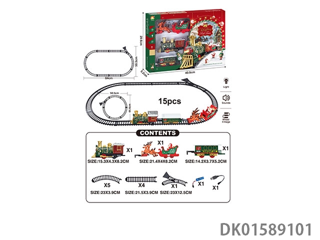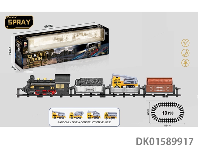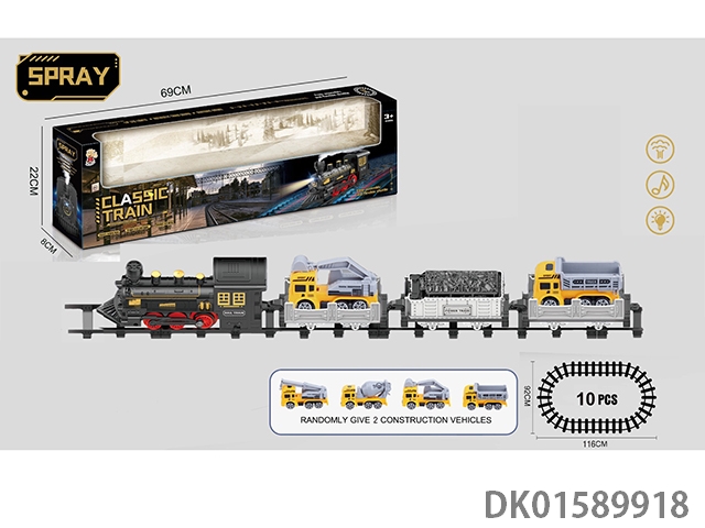 The electric rail train has spray (simulated locomotive, one cargo box and two trailers: two engineering vehicles are equipped with lights and sounds, and four No. 5 batteries are used without electricity