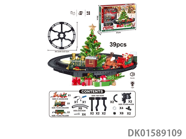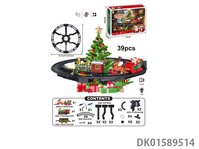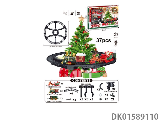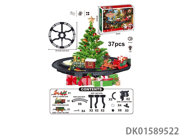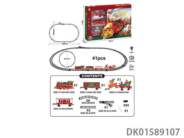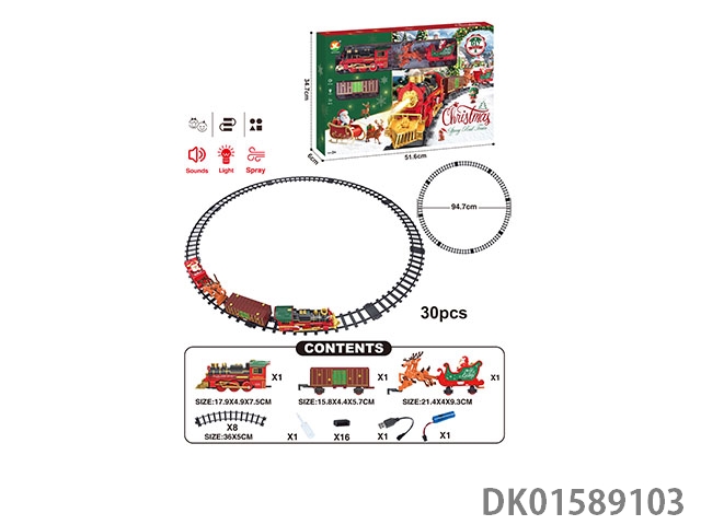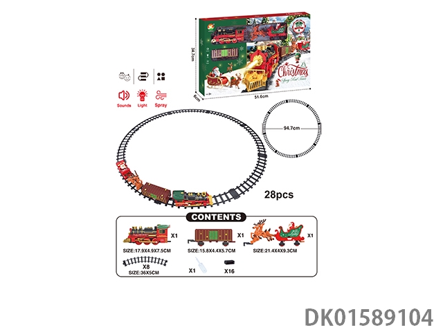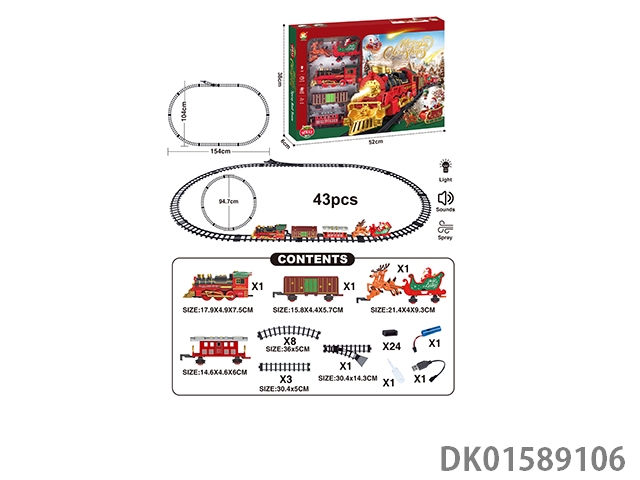 The electric rail train has spray (simulation locomotive, one cargo box and one carriage: one engineering vehicle and one mop are provided at random: three cedars are provided), light and sound, and four No. 5 batteries are used without electricity