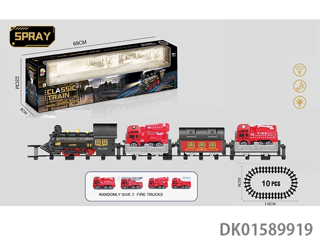The electric rail train has spray (simulated locomotive, one passenger compartment and two trailers: two fire engines are equipped with lights and sounds, and four No. 5 batteries are used without electricity