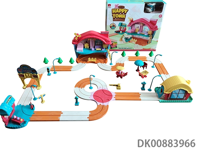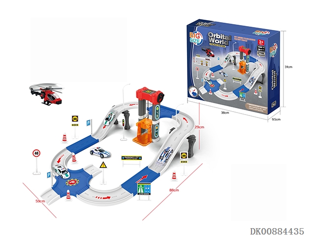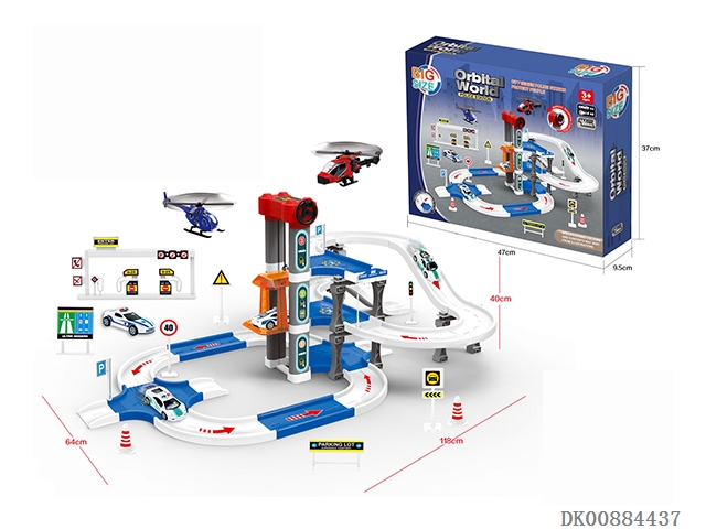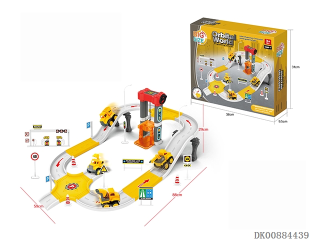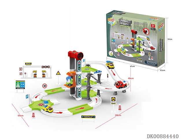 Assemble track parking lot, 2 dinosaurs, 2 taxicars and 1 tree