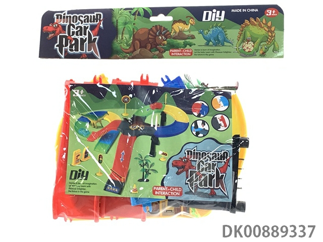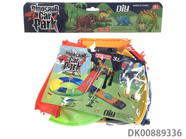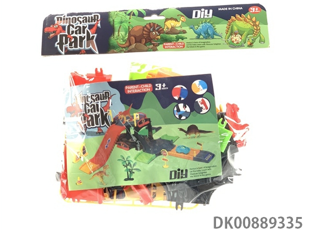 Assemble track parking lot, 3 dinosaurs, 1 taxicar and 1 tree