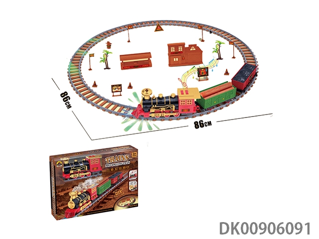 134Pcs of train tracks (2 trees, 3 firewood, 1 house, 1 train, 1 firewood carriage, 1 coal carriage, 1 control room, 12 road signs, 96 wooden tracks and 16 curved tracks)