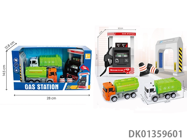 Gas station with ic sound (3 ag13), 2 sanitation oil tank trucks, set of rebound cars, boys playing with toys