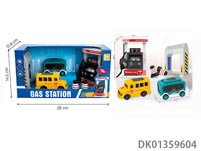 Gas station with ic sound (3 ag13), school bus, 2-car set, inertia car, boys play with toys