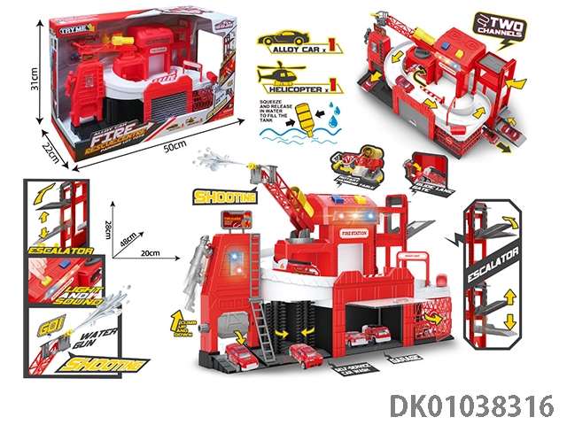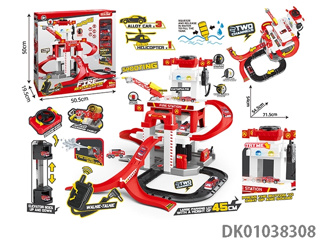 (Lighting and music, ejection and lifting) interphone, water spray tower, multi-function fire headquarters parking lot kit (equipped with 3 alloy cars, 1 aircraft and 1 water bottle) 3pcs 1.5v aa battery without power