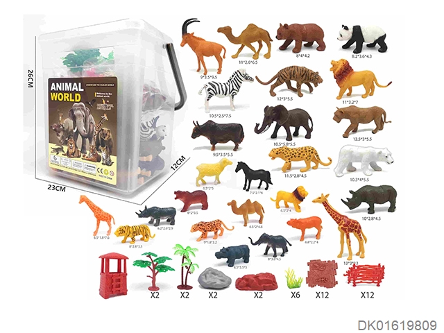 26 Wild animals and 39 accessories in a large barrel