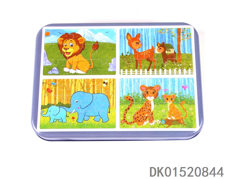 益智拼图4款不同图案动物世界组合铁盒装