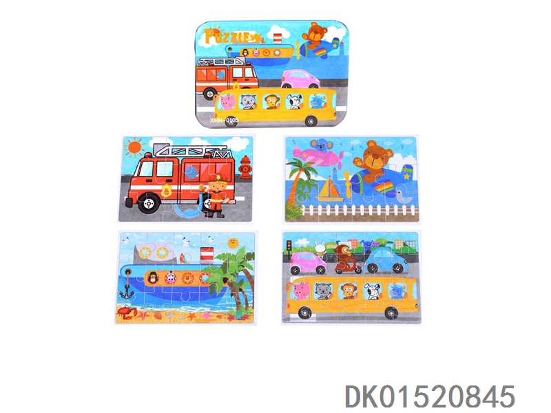 益智拼图4款不同图案交通工具组合铁盒装