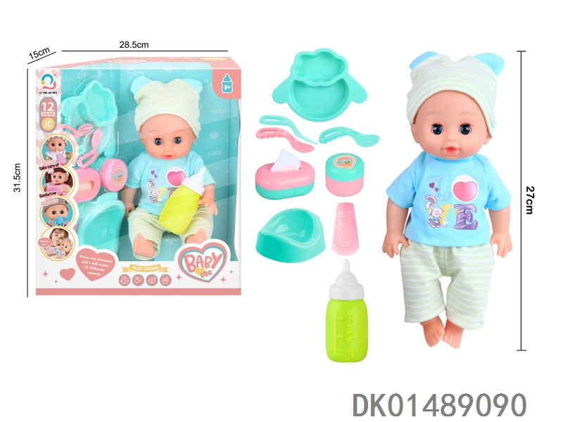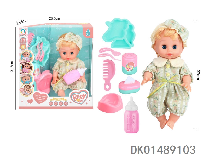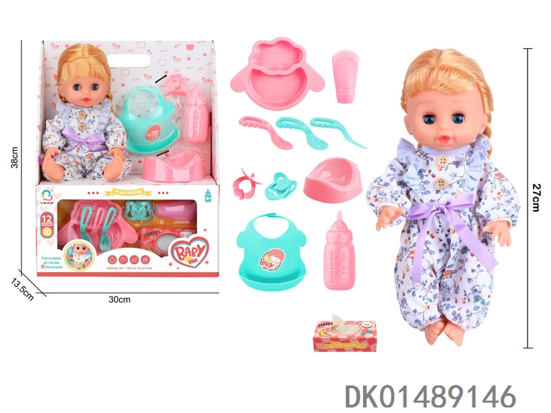 16寸定眼吹瓶身体搪胶手脚女娃娃配奶瓶、奶嘴、吹风筒、梳子、尿壶,带6声IC