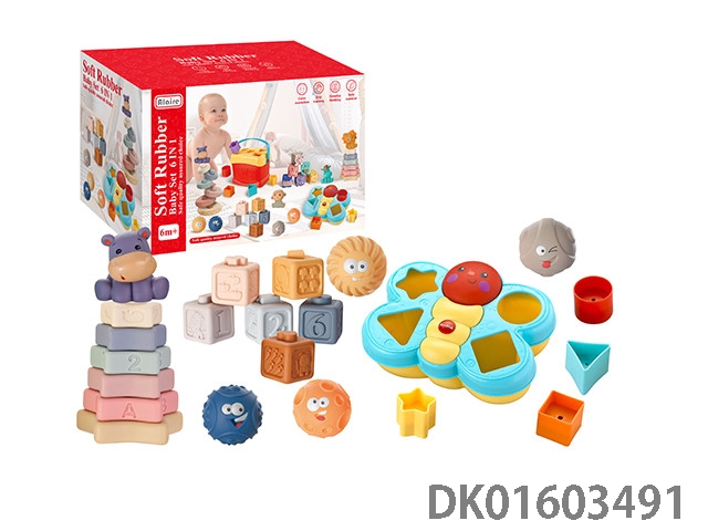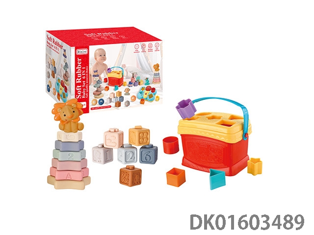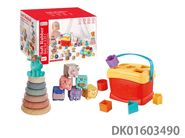 5合一软胶玩具(软胶圆形叠叠乐+软胶积木+方形叠叠乐+婴儿统感求+软胶动物组合)