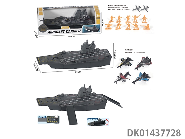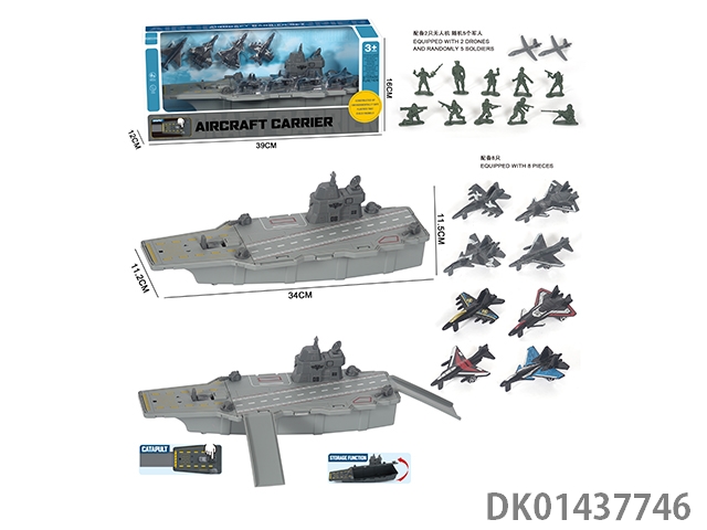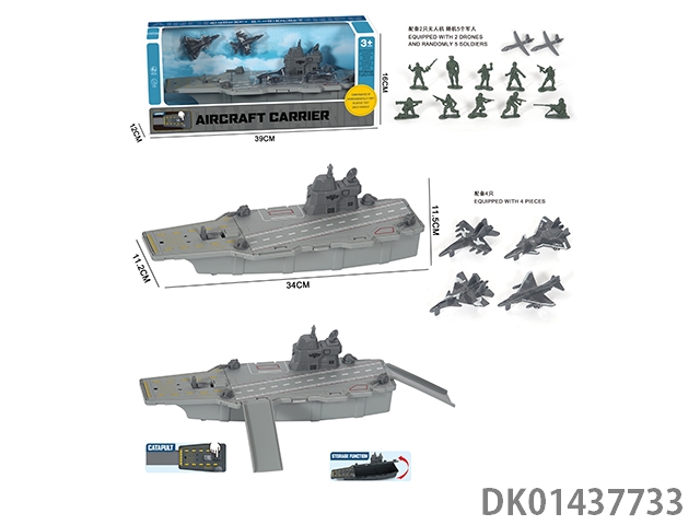航空母舰收纳弹射轨道搭配5身军人2只无人机模型。2只滑行战斗机